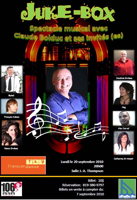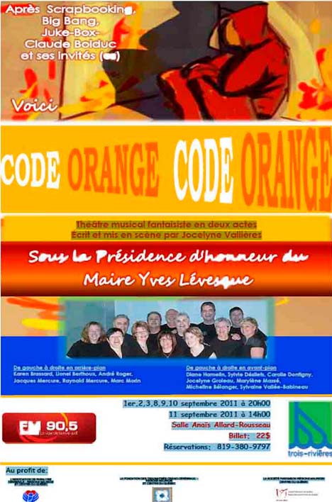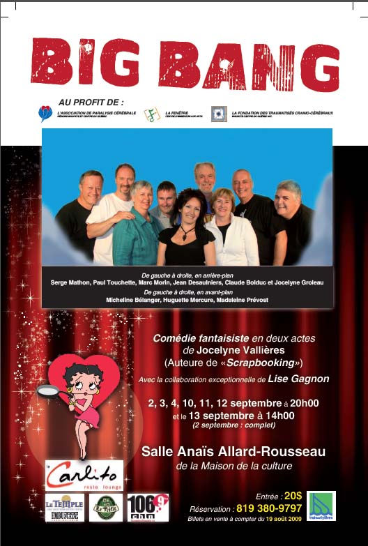 De 2009 à 2016, la conceptrice et metteure en scène Jocelyne Vallières a organisé 7 spectacles bénéfices. En septembre 2009, il y a eu présentation de la pièce de théâtre « Big Bang », suivie en septembre 2010 du spectacle musical « Juke-Box – Claude Bolduc et ses invité(es) », et en 2011, du théâtre musical « Code orange » sous la Présidence d’honneur du Maire Yves Lévesque et du porte-parole Claude Bolduc qui a participé à ces 3 événements avec tout le charisme qu’on lui connaît.